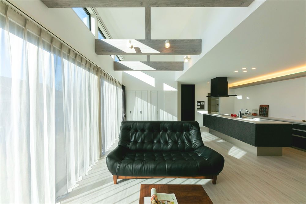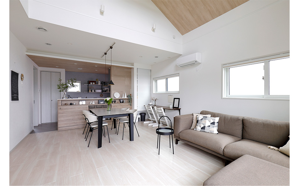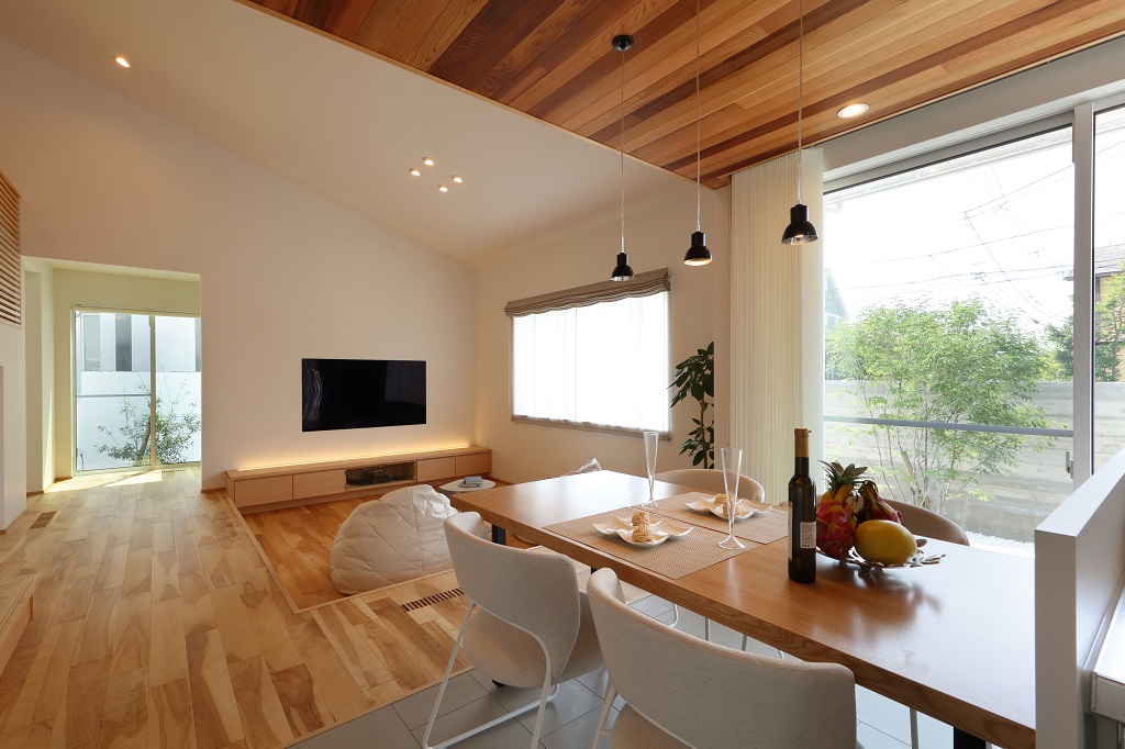 勾配天井でLDKに光が広がる開放感のある平屋IROHA.IE。