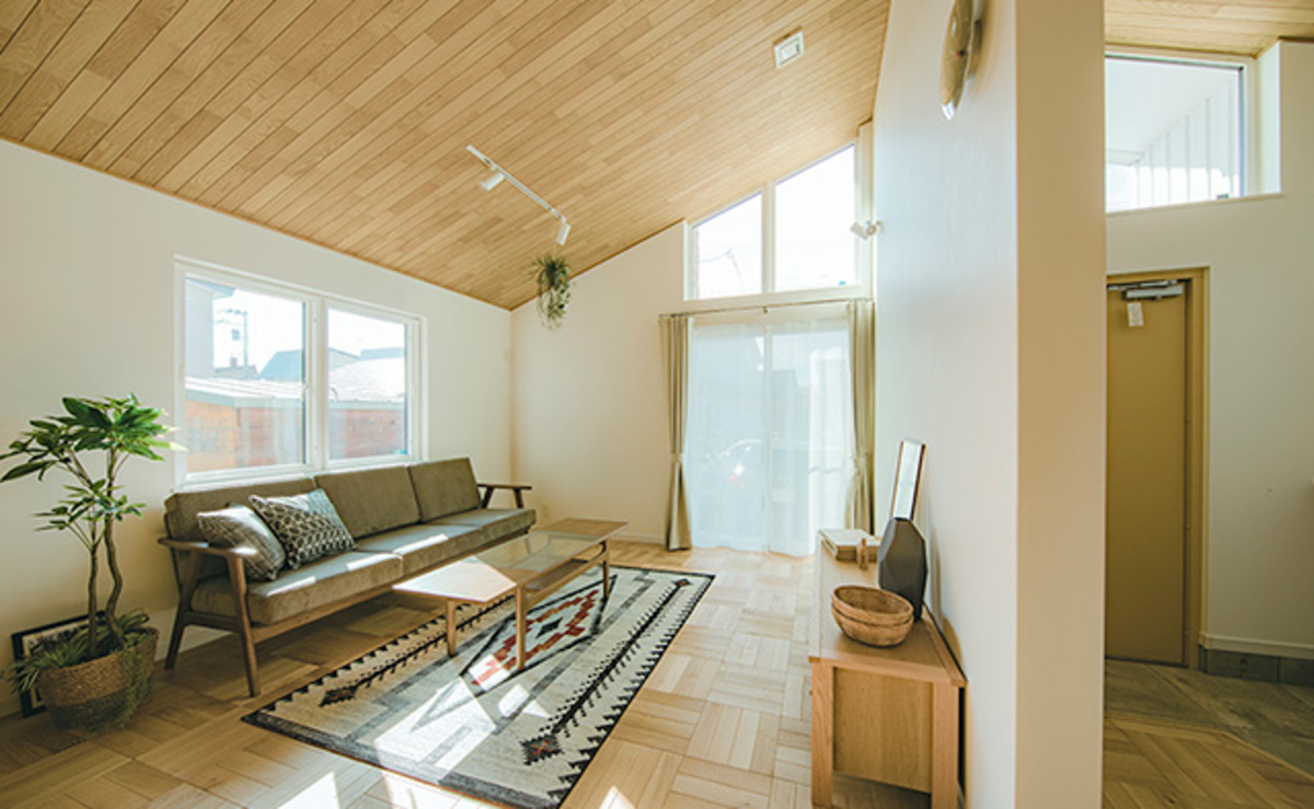 勾配天井のリビングで暮らす平屋 - 名古屋で注文住宅を建てるなら国松工務店にご相談ください。