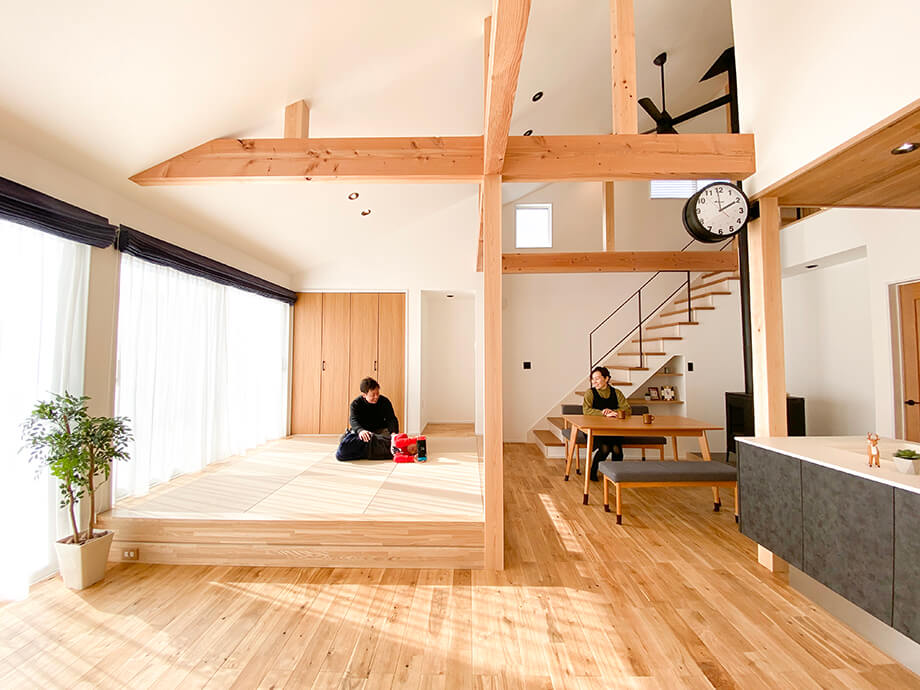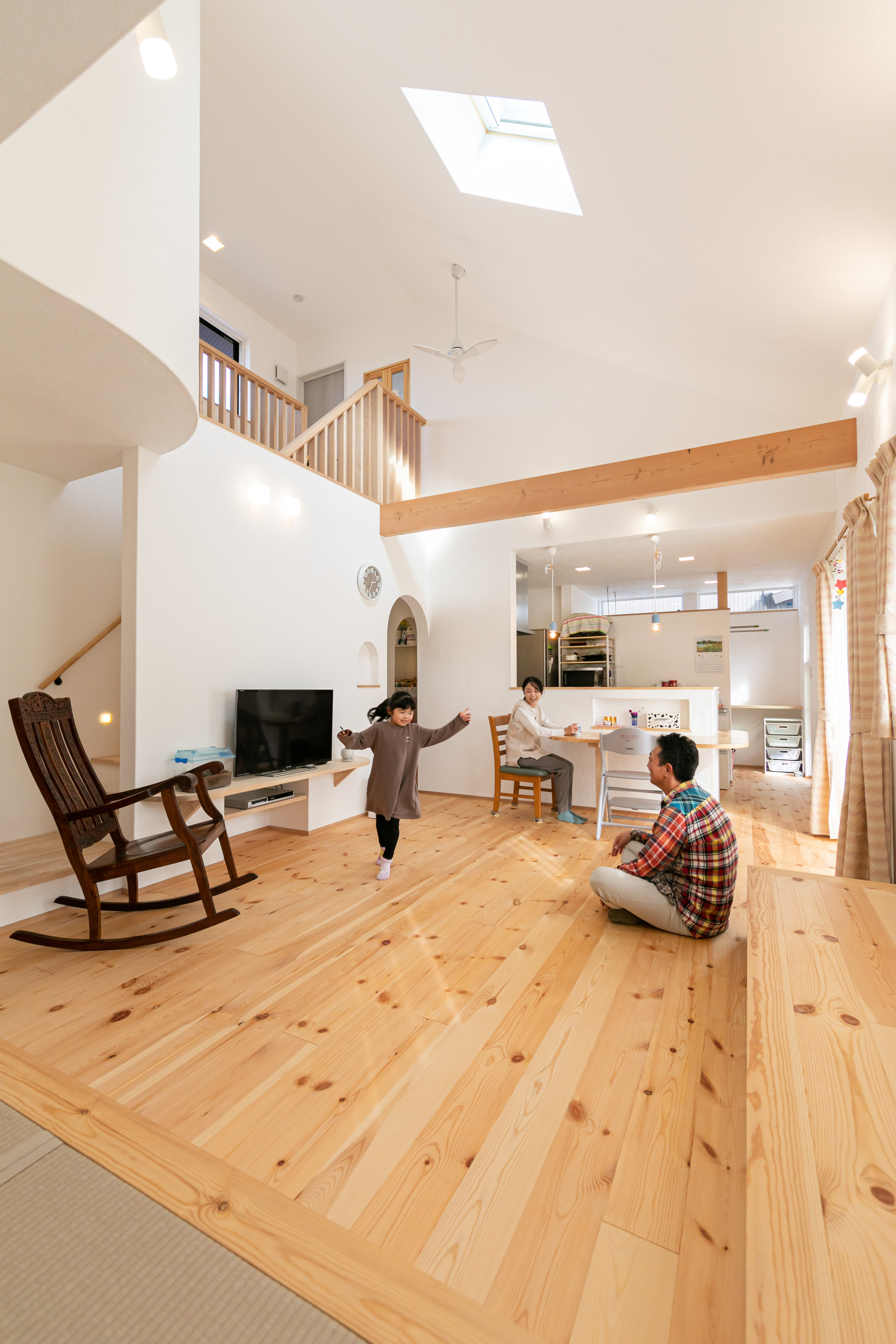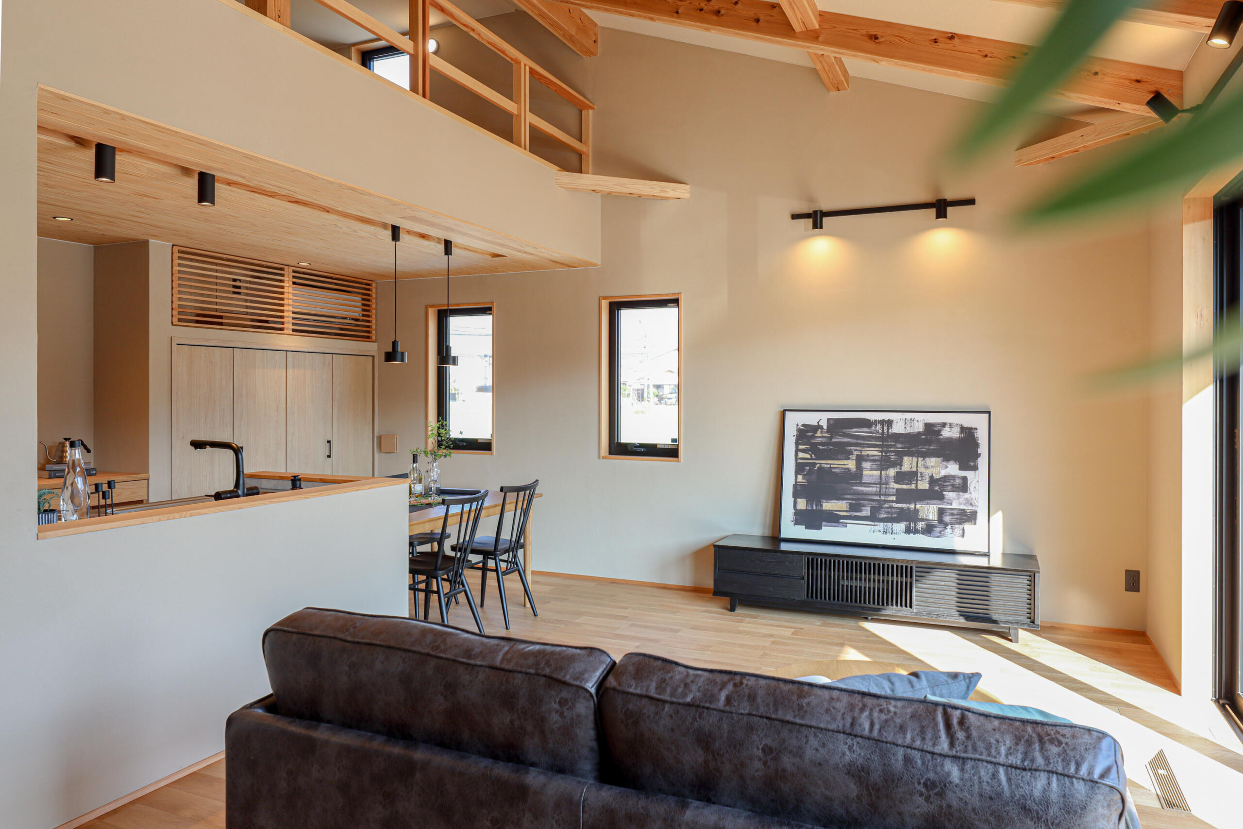 ロフトと勾配天井でつながる、広々リビングの平屋の暮らし施工事例原工務店山口県で「光と風と木の住まい」の注文住宅。