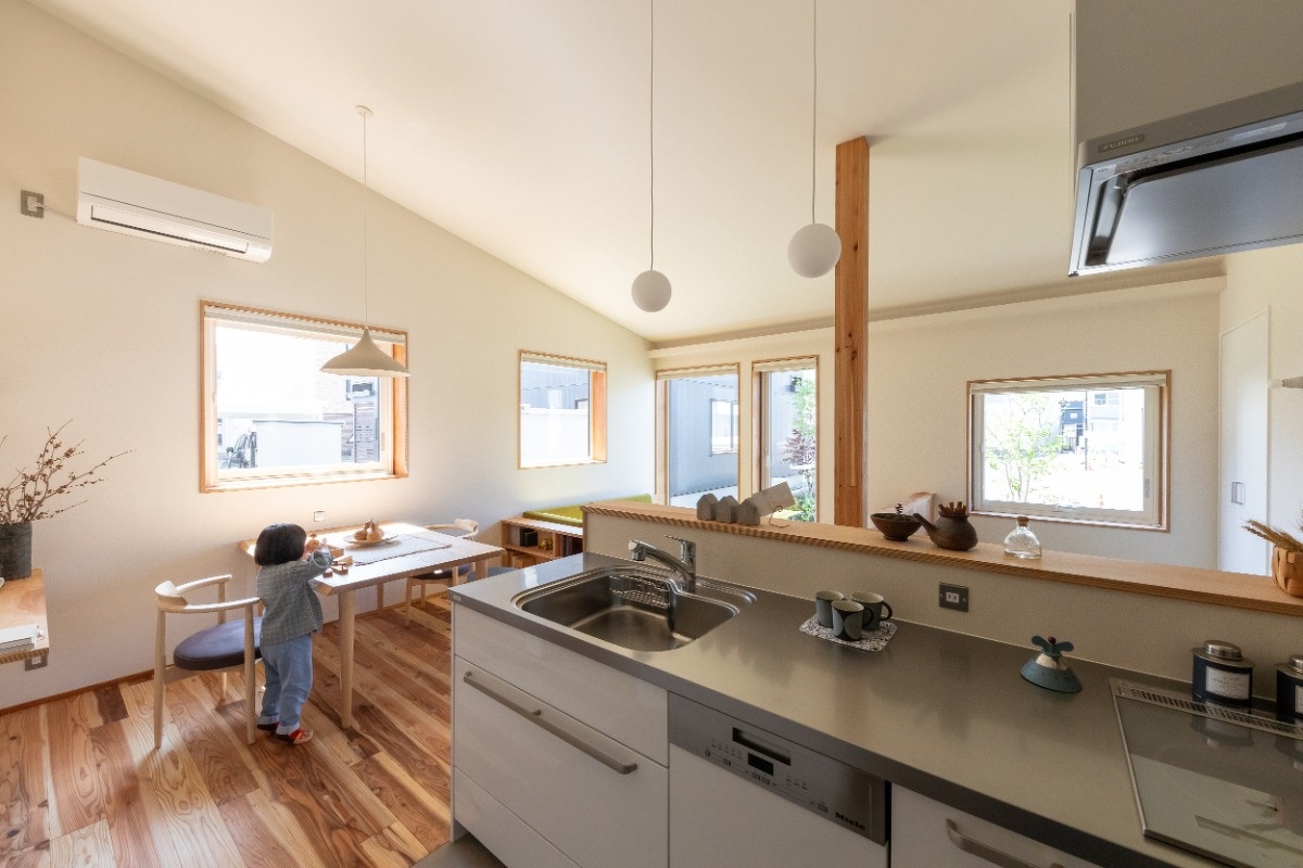 帯広市 新築施工例 勾配天井の開放的なリビングのある平屋住宅十勝・帯広で新築住宅、リフォームの設計・施工を行う 株式会社ティーメイス。
