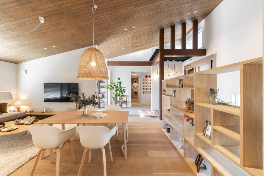 広がりを生む板張り勾配天井の平屋+ロフトの家 – 長野県松本市工務店 木族の家。