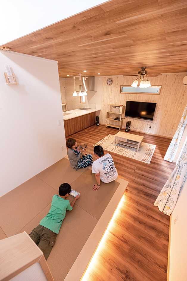 小上がりの畳コーナーは家族みんなのリラックススペース。吹抜けを見上げると開放感が増す。畳下の間接照明でおしゃれに演出 くふうイエタテ。