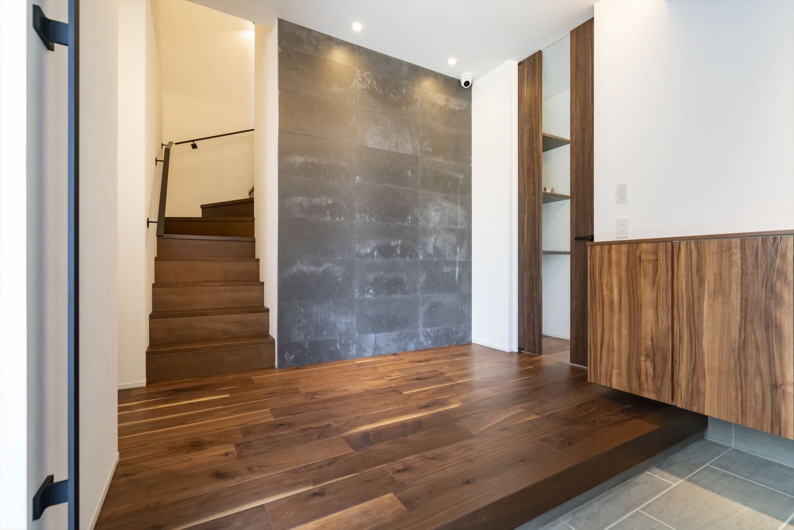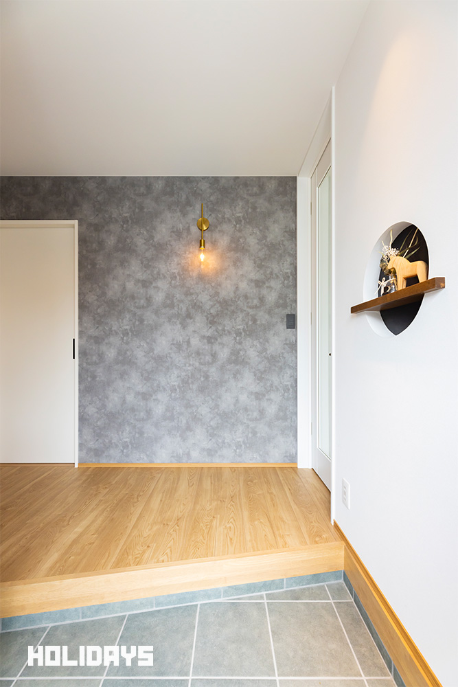 玄関ホールのウェルカムニッチが、訪れる人を温かく迎えるデザインに。コンクリート調の壁紙がスタイリッシュで洗練された印象を演出 -事例写真「小屋裏収納のある家」注文住宅のハウスネットギャラリ。