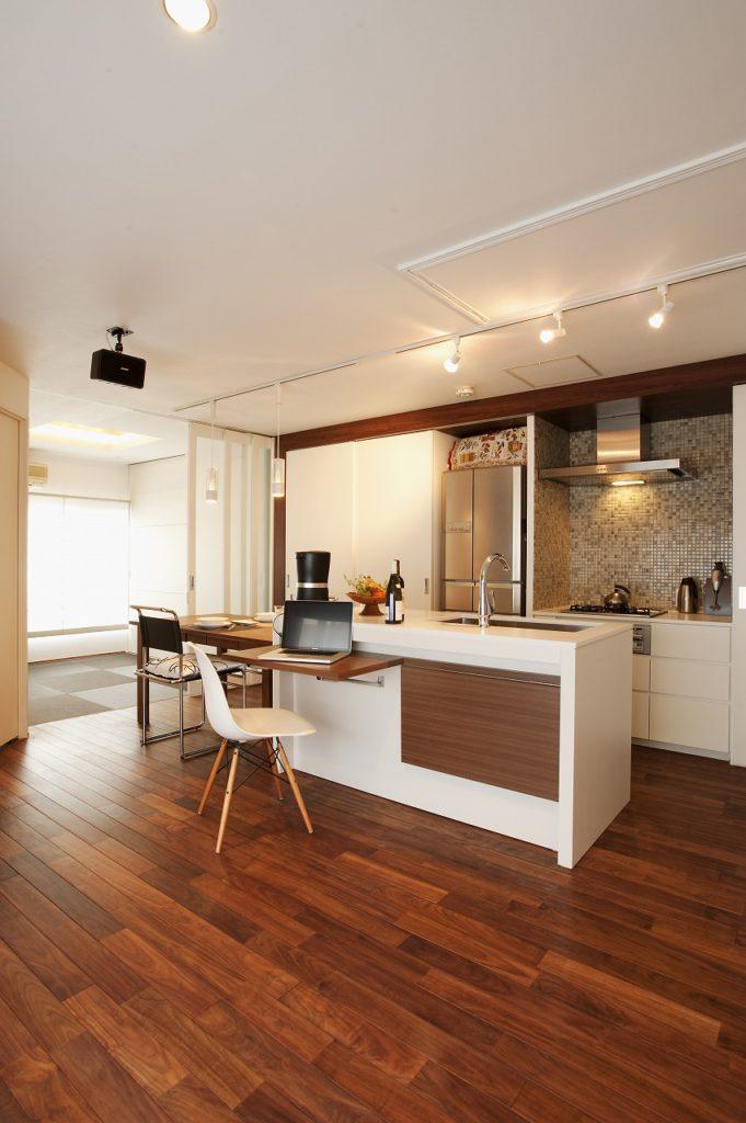 ウォールナットの床材と省スペースのパソコンカウンター M邸・家族と囲む、明るいキッチン- リビングダイニング事例SUVACO スバコ。