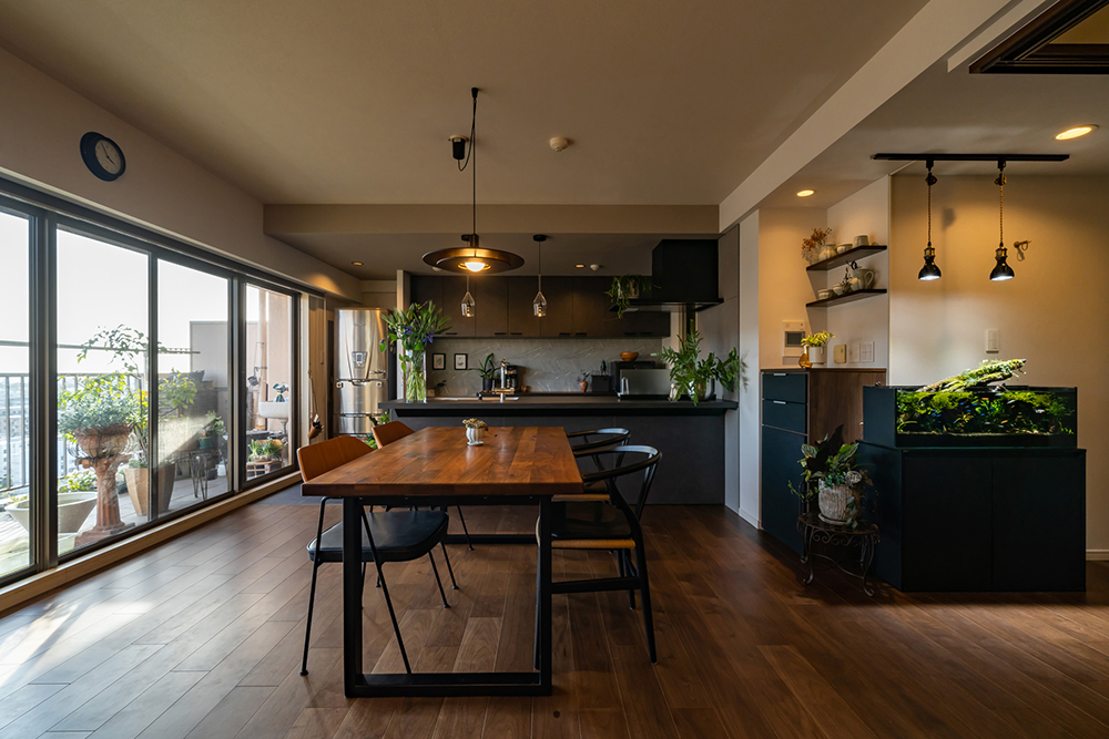 ウォールナット×ブラックにグリーンが映える、ヴィンテージモダンスタイル千葉でリフォーム・リノベーションなら家CoCoうちここ創業30年デザインリフォーム専門店。