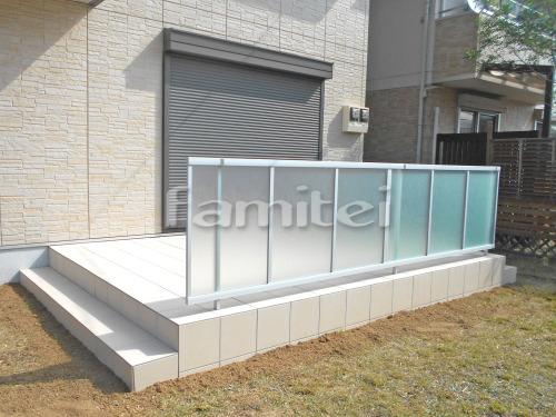 施工例:相楽郡精華町 リフォーム庭園工事 目隠しフェンス塀 LIXILリクシル ライシスP型 すりガラス調 タイルデッキ LIXILリクシルライムアレーナ300角 LN-12 階段ステップ1段 自転車バイク屋根 LIXILリクシル 独立式フーゴF 1階用 F型フラット屋根 隙間ふさぎ材物干し。