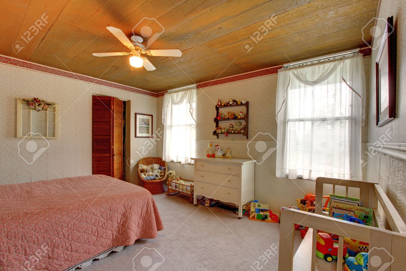 古い昔ながらの家インテリア壁紙の壁、木の板パネル天井とアンティーク キャビネット。おもちゃでいっぱい部屋の写真素材・画像素材 Image28613217。