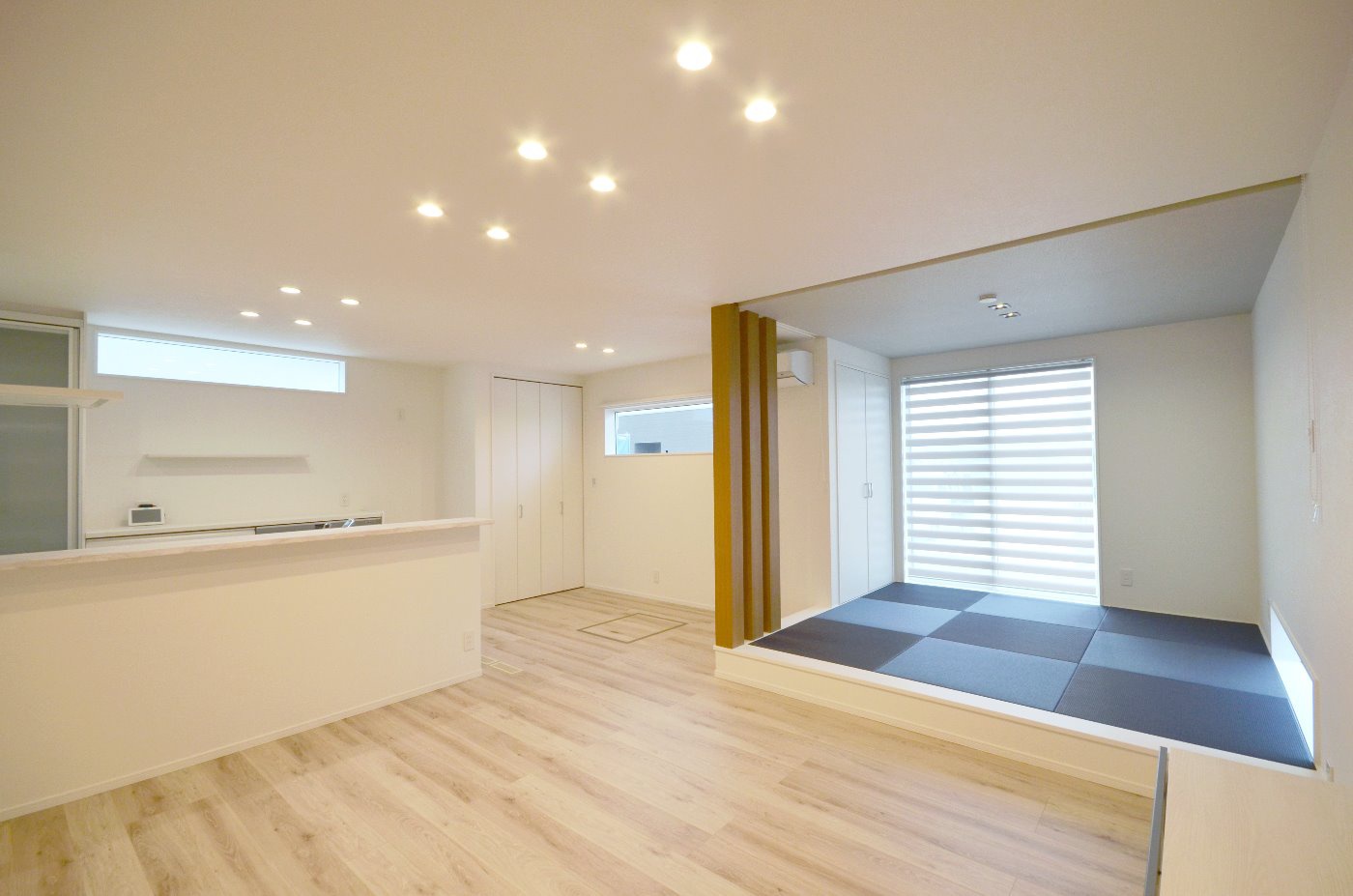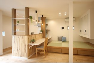 リビングにマガジンラックつきのフラットな畳コーナーと化粧柱 : 注文住宅ブログ 大阪京都で注文建築専門の工務店は匠建枚方。