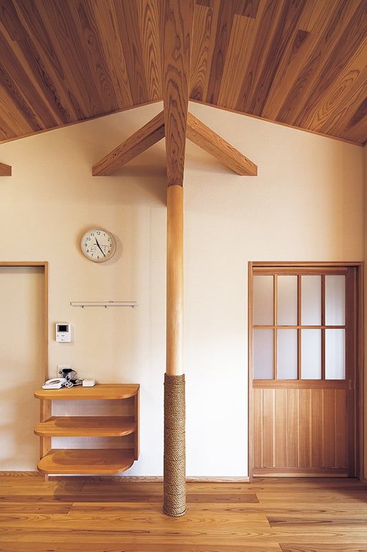 リビングの柱に巻いた縄は、愛猫がいたずらしないための工夫だ。チルチンびと 木の家広場。