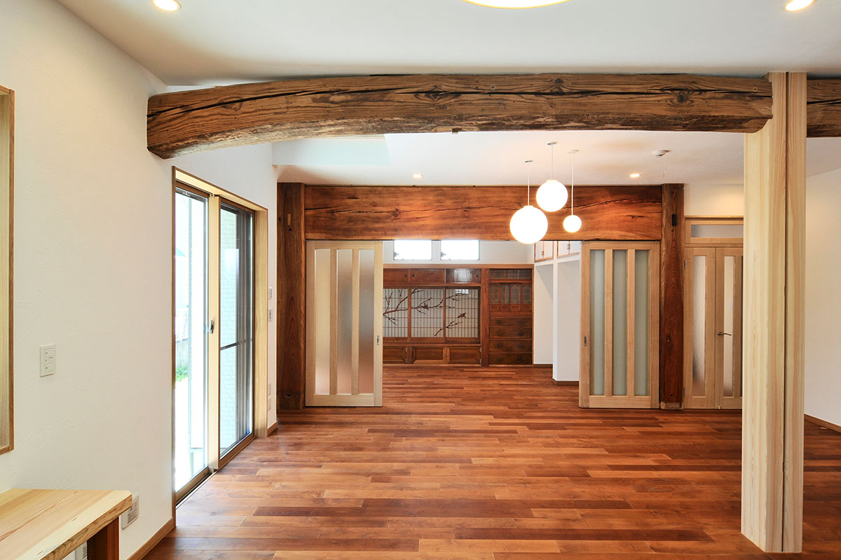 古材の差し鴨居と柱と5枚の引戸で空間を区切る。旧宅の水屋箪笥も復元したリビング - 事例写真「古民家再生材木屋が造る無垢の家」注文住宅のハウスネットギャラリ。