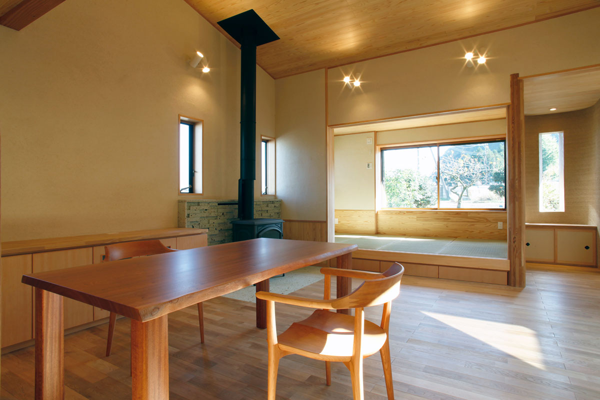 丸い柱を大黒柱のようにアクセントにしたリビングダイニング 1段あがった畳コーナーの下は大きな引き出し収納にしています。右側は床の間のようにした飾り棚を。長い窓は掛け軸をイメージして、外の景色を楽しめるように設計- 事例写真「中庭のある平屋の家 長期優良。