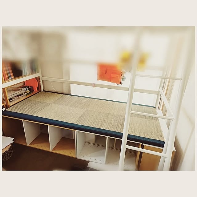 元々は 部屋に“小上がり”が欲しくて、ニトリのカラーボックスを代用して作った物を レイアウト変更して ベッドにしただけです。構造はとても簡単なのですが ある程度の強度を持たせる為に 24ミリの構造用合板を使いました。冬場は 更にレイアウトを変えて 掘り炬燵風にし。