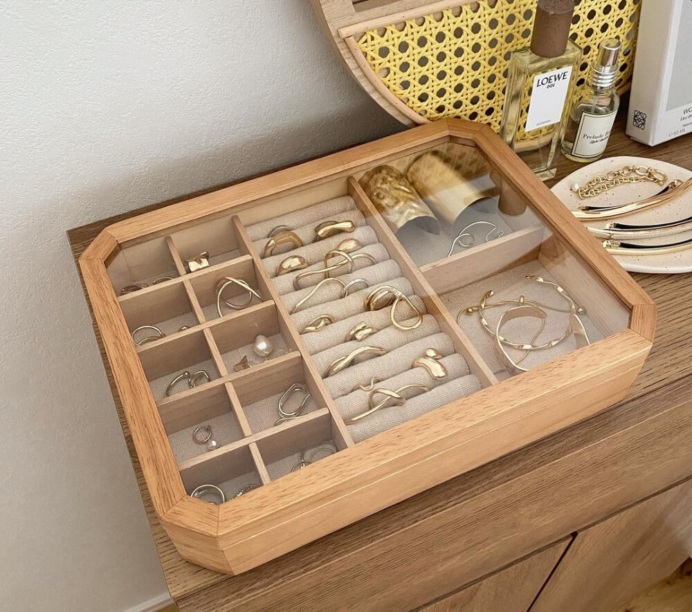 ジュエリートレイ 蓋付き 木製 ジュエリーボックス 多機能 指輪 イヤリング ネックレス ディスプレイ 収納 透明 高級 おしゃれ真似したくなる!おしゃれなアクセサリー収納55選 100均アイテムや意外なアイデアもRoomClip mag暮らしとインテリアのwebマガジン。