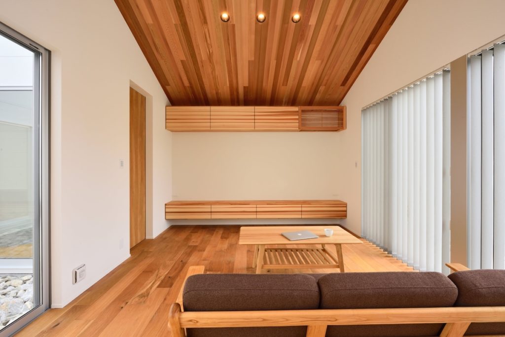 無垢材の床やテーブルに合わせた造作家具の吊棚とテレビボード 家族が集まる寛ぎのリビング- リビングダイニング事例SUVACO スバコ。