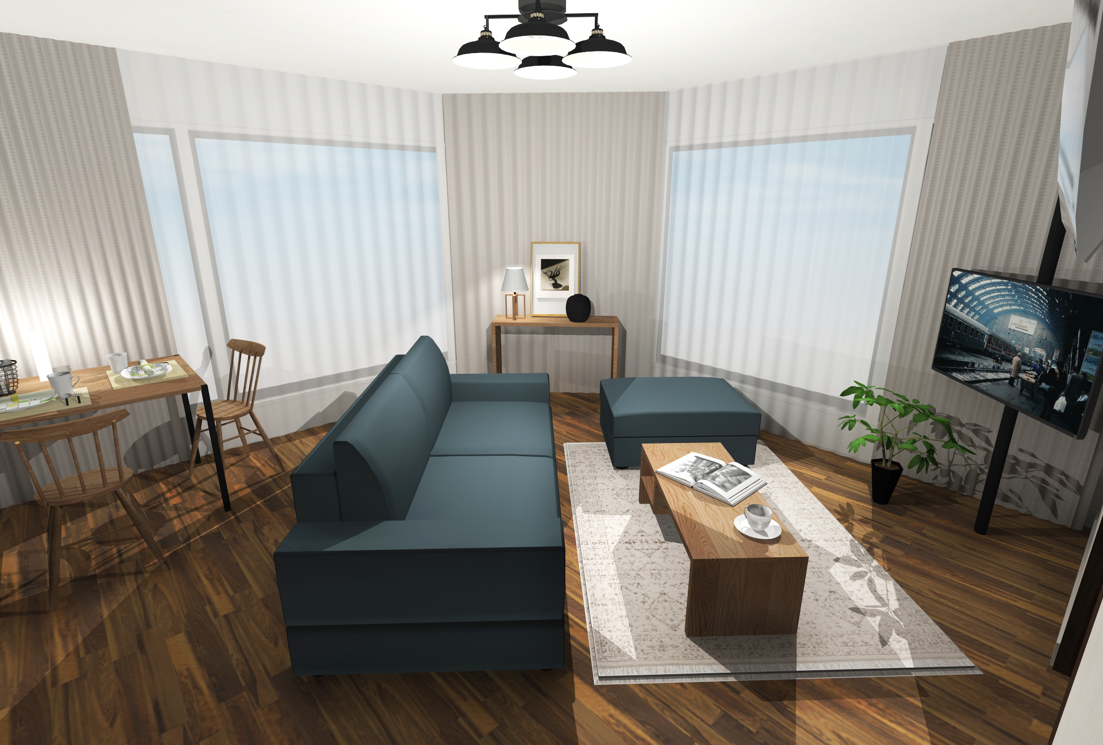 12畳・横長リビングダイニング、ダークグレーのカーテンを取り入れたインテリア - RE -アールイ。