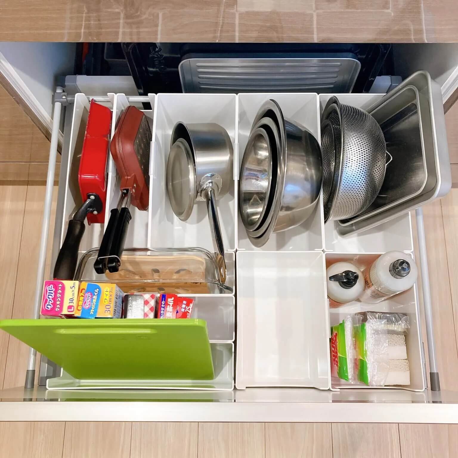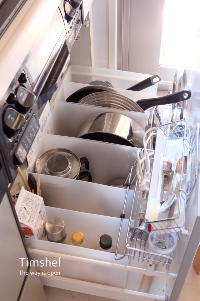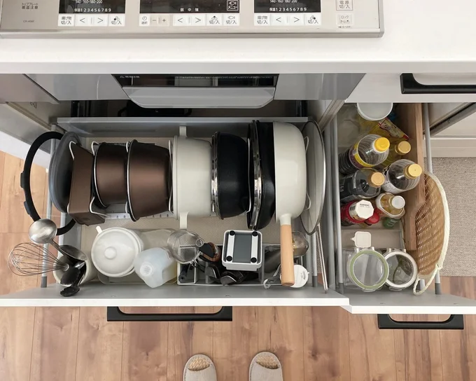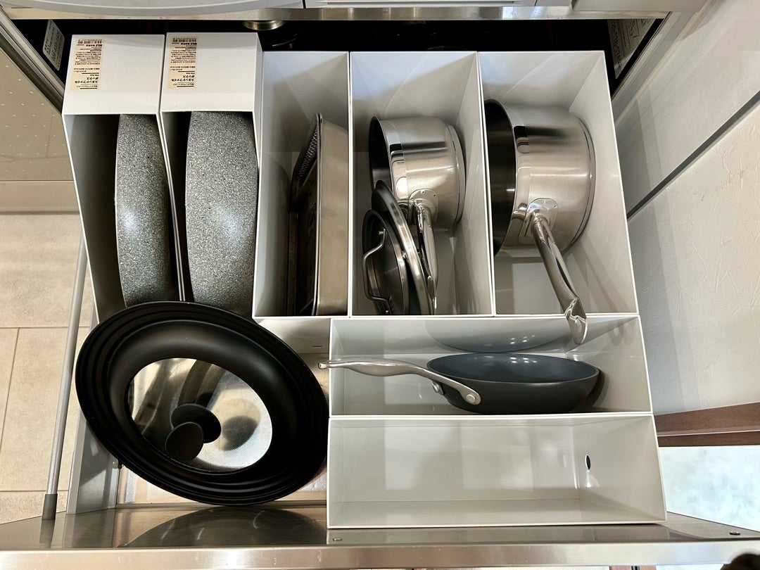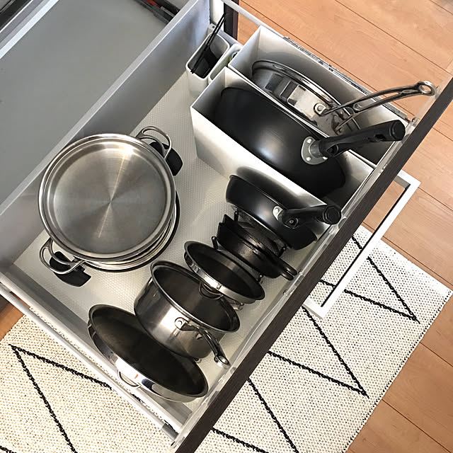 無印良品 フタを裏返すだけ!仕切り板2つで鍋もフライパンも全てスッキリ!キッチンコンロ下収納。収納術や整理整頓のアイデア暮らしニスタ。