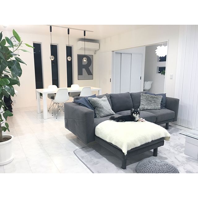 白×黒×グレー×オークの配色がとってもが素敵なこちらのお宅🏠✨ たっぷりと窓の大きさを取った吹き抜け天井のリビングは開放感と日当たりが抜群ですね🤩昼間はもちろん夕焼け時の影にも見とれてしまいます💕 厳選されたインテリア&雑貨でどこを見てもとってもすっきりし。