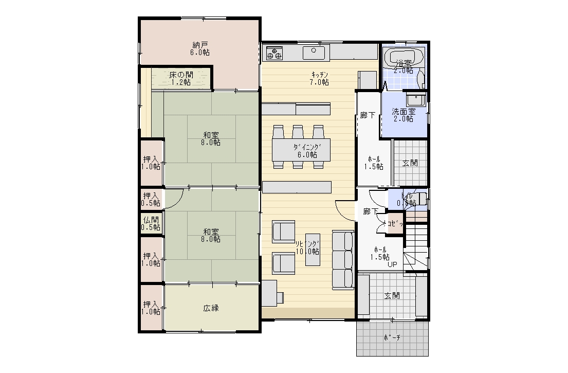大川市 約40坪 3LDK 2階建て リビング続きの小上がり和室の家大川市の工務店で平屋・二階建て注文住宅を建てるならメイクハウス:柳川市。