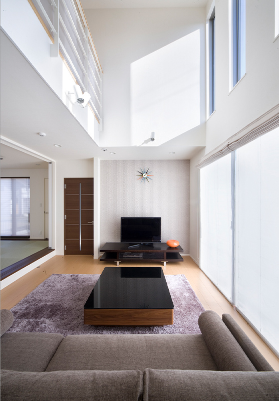 2階リビングのメリットを活かした勾配天井で、明るく広いリビングを実現。下部全面収納の和室も造作。階段付近には、節句飾りにもちょうどいいデスク。