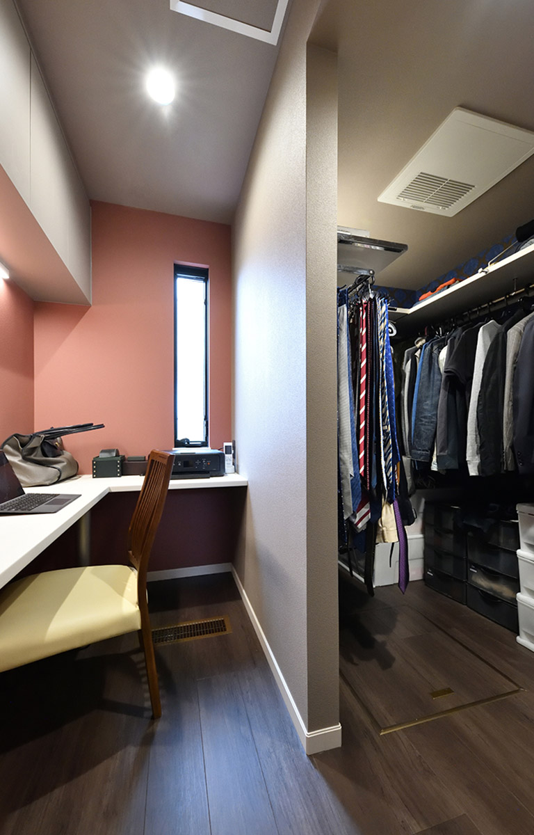 ウォークインクローゼット収納 主寝室に隣接した書斎コーナー スタディコーナー -事例写真「モノトーンでまとめた、スタイリッシュな家」注文住宅のハウスネットギャラリ。