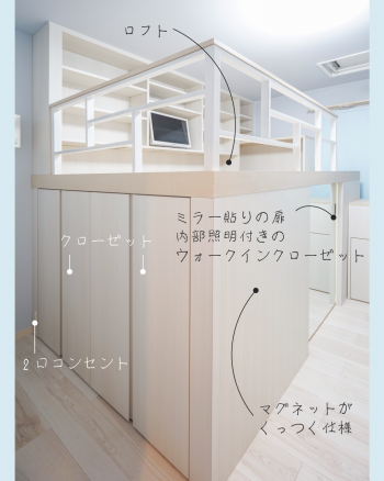 ウォークインクローゼット機能付きロフトベッド。