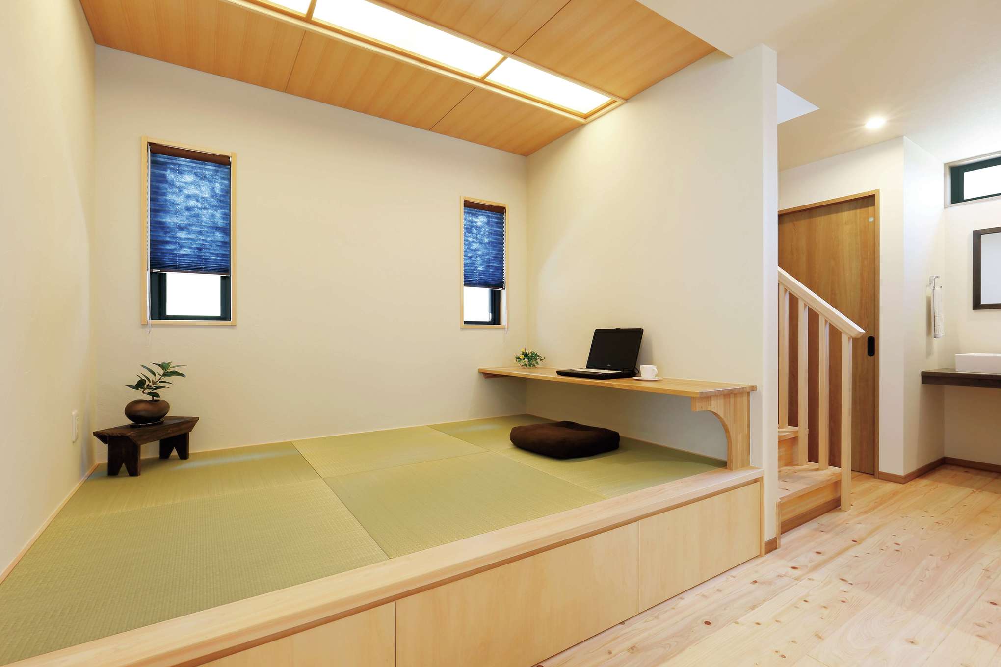上質な壁紙と間接照明が空間を引き立て、モダンなデザインの床下収納を備えた使い勝手の良い小上がりの和室 -事例写真「館林ハウジングステージ店」注文住宅のハウスネットギャラリ。