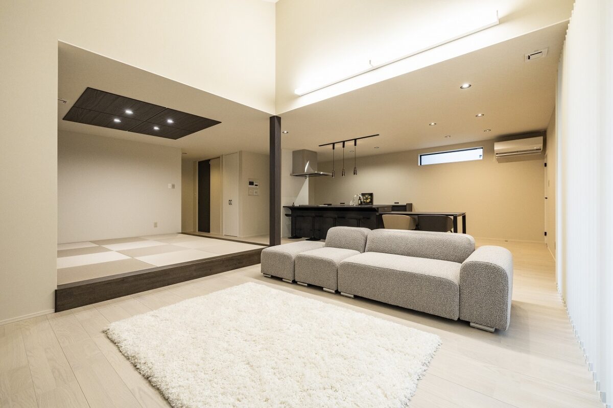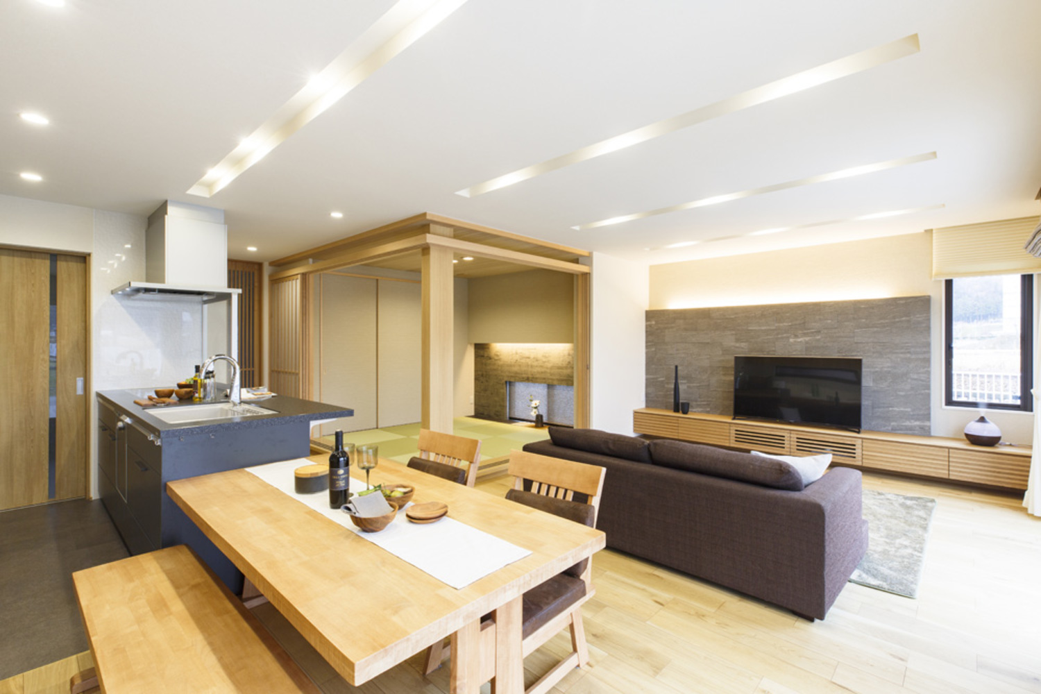 リビングに和モダンで便利な畳コーナーをレイアウトおしゃれな和室のある贅沢なLDK間取り東京・神奈川・愛知の注文住宅ならアクティエ。
