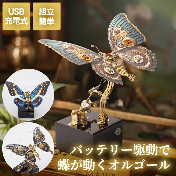 立体パズル 昆虫 オルゴール キット DIY バタフライ 3D 蝶々 動く メタル USB充電式 組立式 スチームパンク 機械模型 アンティーク風ヴィンテージ風 中世風 インテリア おしゃれ 金属 メタリック 置物 大人 ギフト プレゼント 贈り物 対象年齢16歳以上選べる特典付。