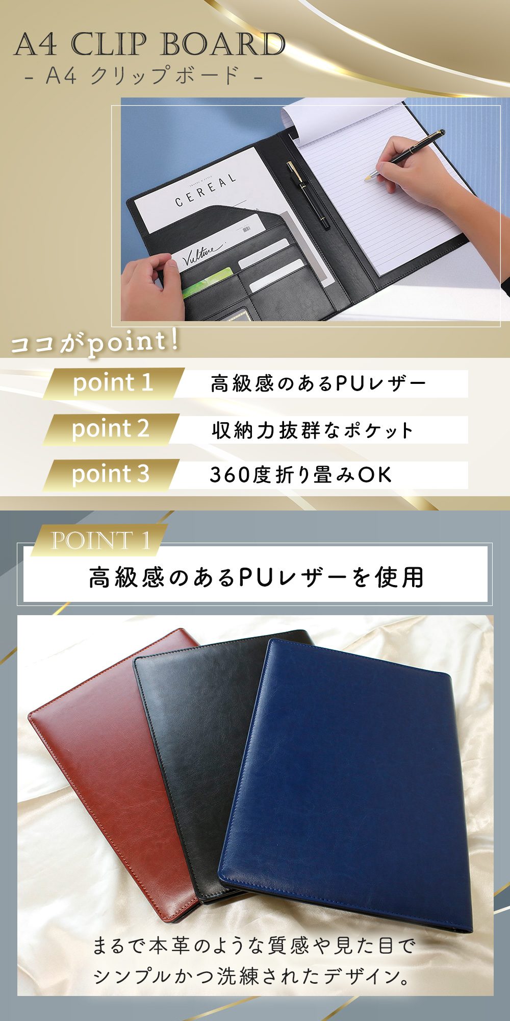 クリップボード A4 A5 PUレザー おしゃれ ファイルバインダー 薄型 コンパクト 軽量 メモ 伝票 名刺入れ ポケット ペンホルダー付き折りたたみ 収納 高級感日用品雑貨・室内,その他mitas。