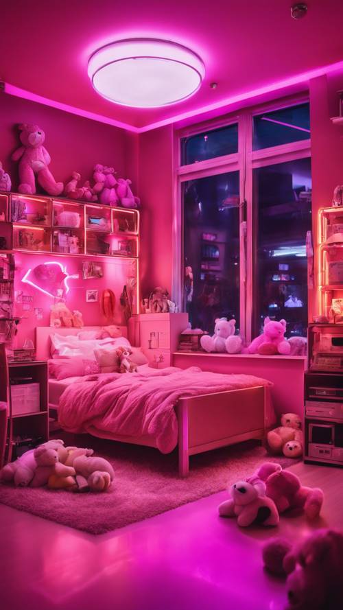 配布中 ネオンライトとぬいぐるみいっぱい!ピンク色が主役の10代の女の子の部屋 壁紙 by Wallpaper HDWidgetClub。