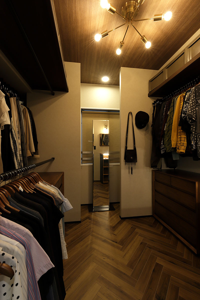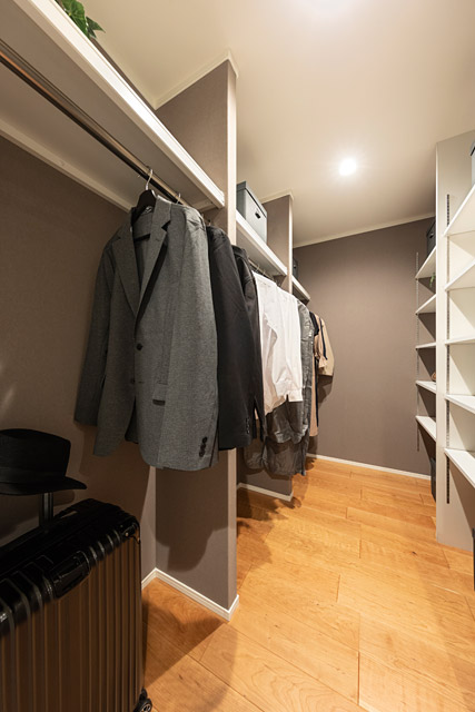 落ち着いたトーンの壁紙が洋服の整理を快適にする広々としたウォークインクローゼット収納 -事例写真「イデアホーム「モデルハウス」」注文住宅のハウスネットギャラリ。