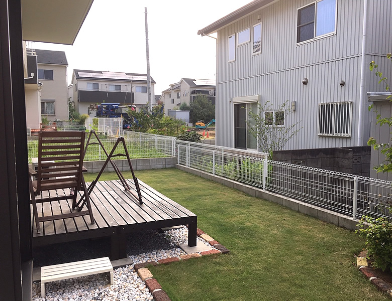 人工芝のお庭と木調の目隠しフェンス 郡山市S様邸。