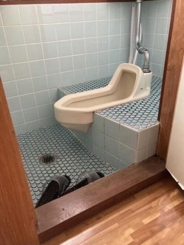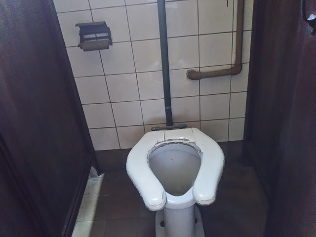 どこからどう見ても昭和なトイレを見かけました。 時代を感じました。 和式トイレ、昭和の時代は金隠しの部分が半円でした。 確か昭和末期か平成になってから金隠しが台形になった気がします。昭和のトイレを昭和生まれが使いました。立ってするのは勿体ないから。