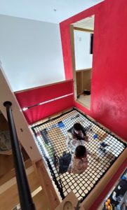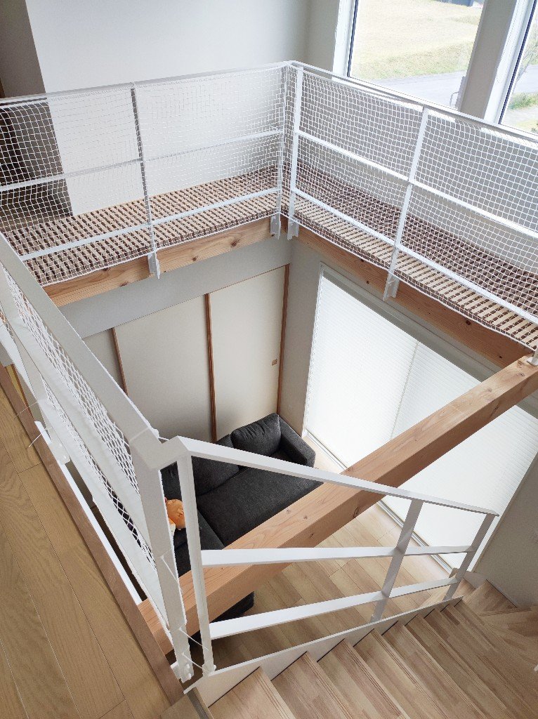 吹き抜け部のスケルトン階段に転落 落下 防止ネットを取り付けました。これで小さな子供がいても安全です。