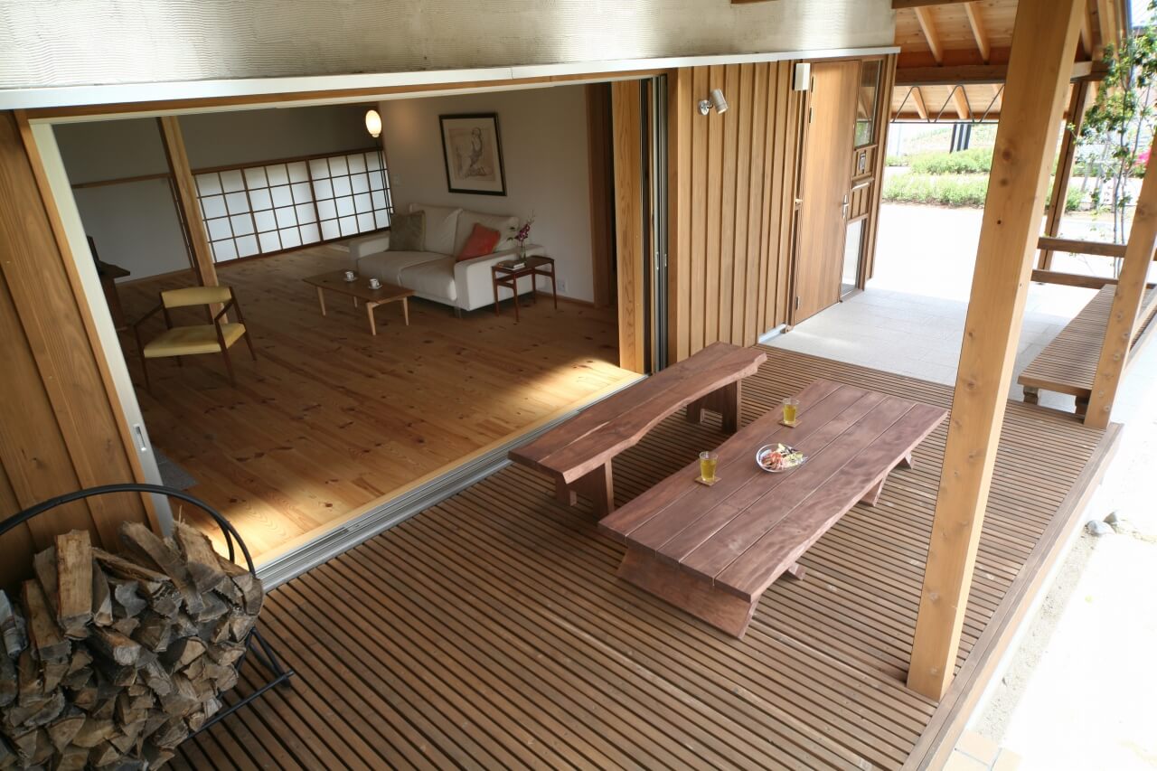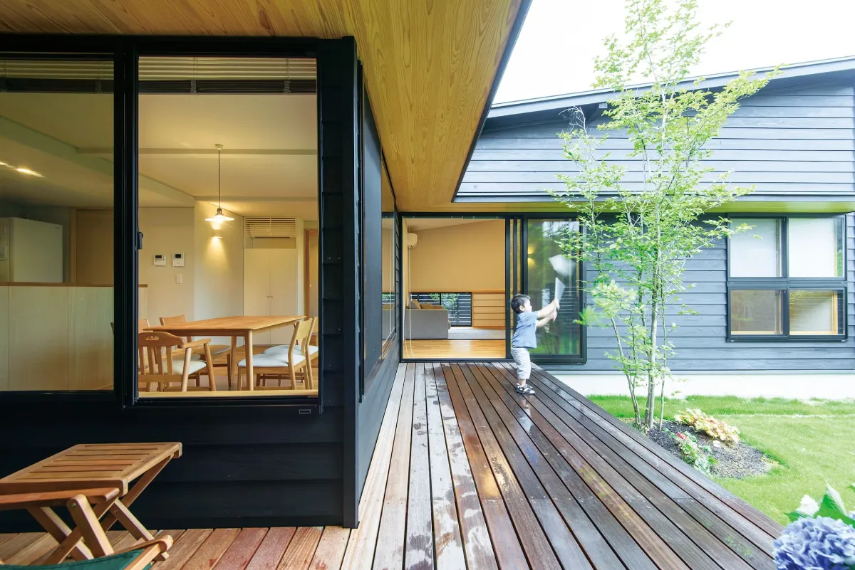 ウッドデッキをのぞむ開放感あふれるリビングと小上がり和室の家ユーセイの暮らしを紡ぐ家づくり。