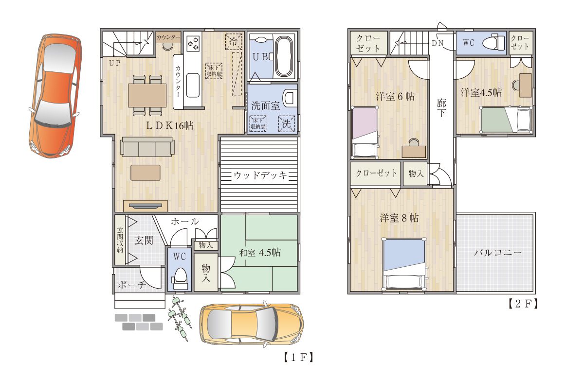 家と庭がつながる!ウッドデッキのある2階建て間取り。