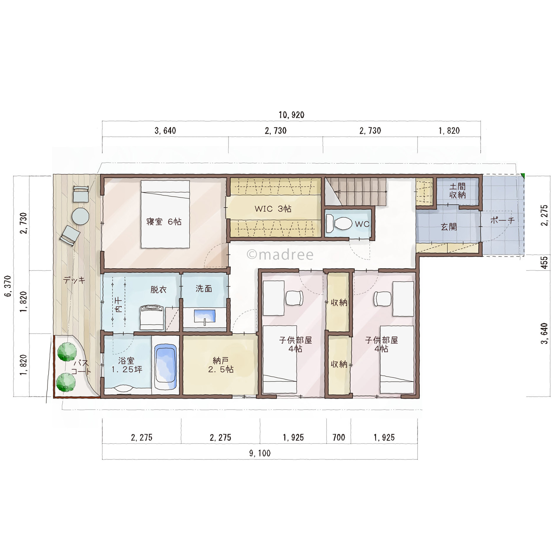 37坪 4LDK横長LDKから一体的に広がる、室内の延長として過ごせるウッドデッキのある家の間取り図「madree マドリー 」。