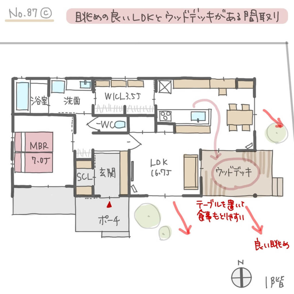 間取りプラン ウッドデッキのある家事ラクな平屋。