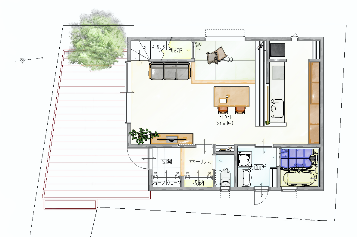 注文住宅 間取りプラン 45坪 大きなウッドデッキと水槽があるペットと住む家栃木県宇都宮市の工務店 薄井工務店。