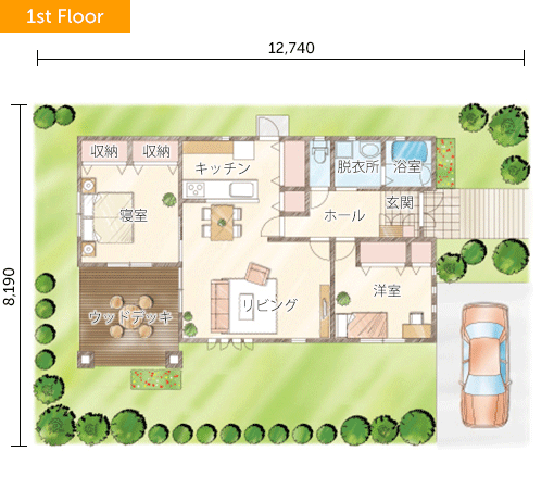 平屋住宅間取りプラン ガーデニングも楽しめるウッドデッキのある家 約24坪::平屋や二世帯住宅の間取りプラン、注文住宅なら福知山市の公正産業。