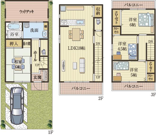 ウッドデッキとガレージ36坪の間取り建築のフロンティアワールド。