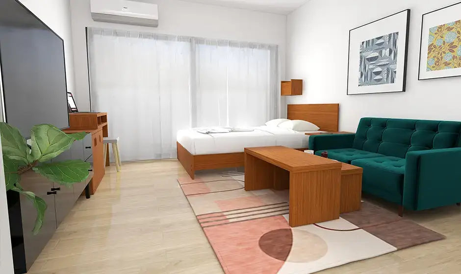6畳ワンルームで快適に過ごすレイアウトとコーディネートのポイント!高級家具リースレンタル・インテリアコーディネートのメイズ。