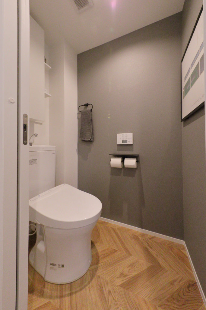 グレーのヘリンボーン柄クロスでモダンなトイレ空間。