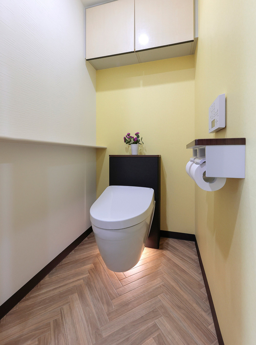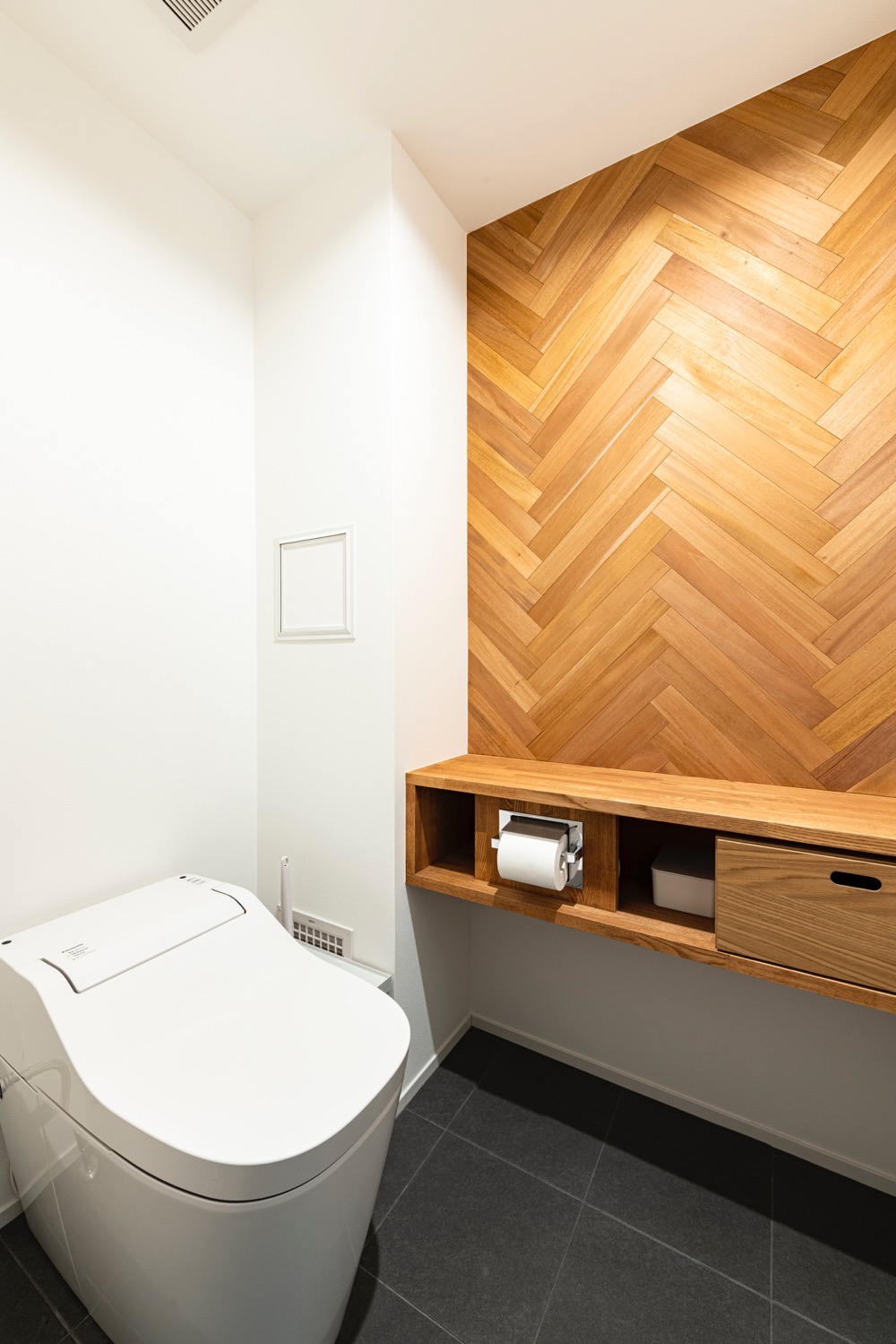 ヘリンボーン柄がオシャレなトイレ 暮らしの質が向上!収納力にこだわった快適な住まい- バス トイレ事例SUVACO スバコ。