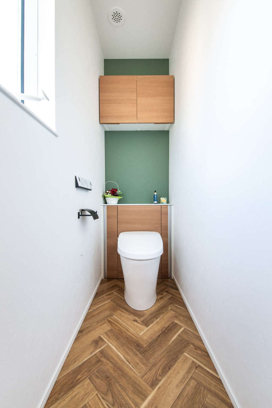 ヘリンボーン柄×グリーンのナチュラルテイストなトイレ 施工事例神戸市中央区のトイレリフォームは「みずらぼ」。