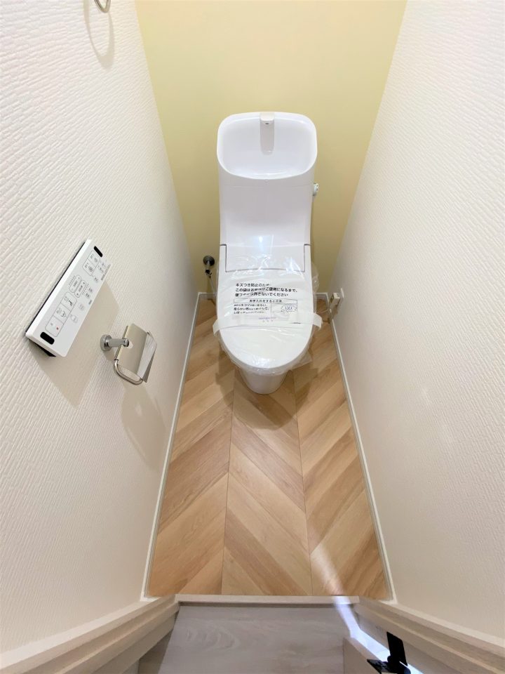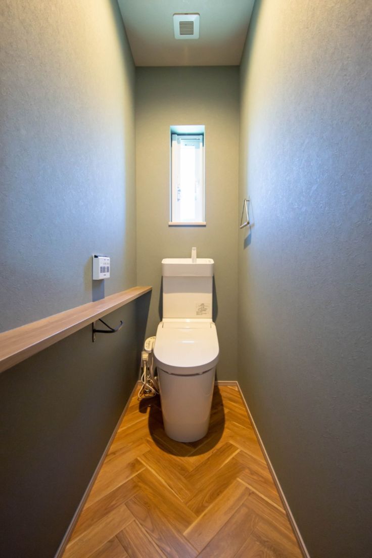 ヘリンボーンの壁紙がオシャレなトイレ くふうイエタテ。