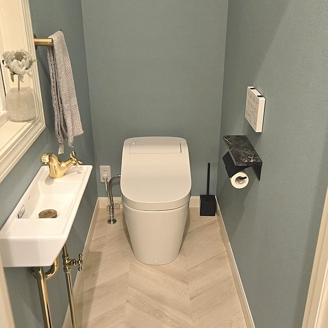 シックで上品なトイレ・ グレーの壁とヘリンボーンの床からモダンさを感じるトイレをご紹介。グレーの壁面がシックな空間の中でドライフラワーが雰囲気を格上げしています🌟 ペーパーは壁にスッキリ収納され、まるでインテリアの一部のようですね✨ ・photo by。