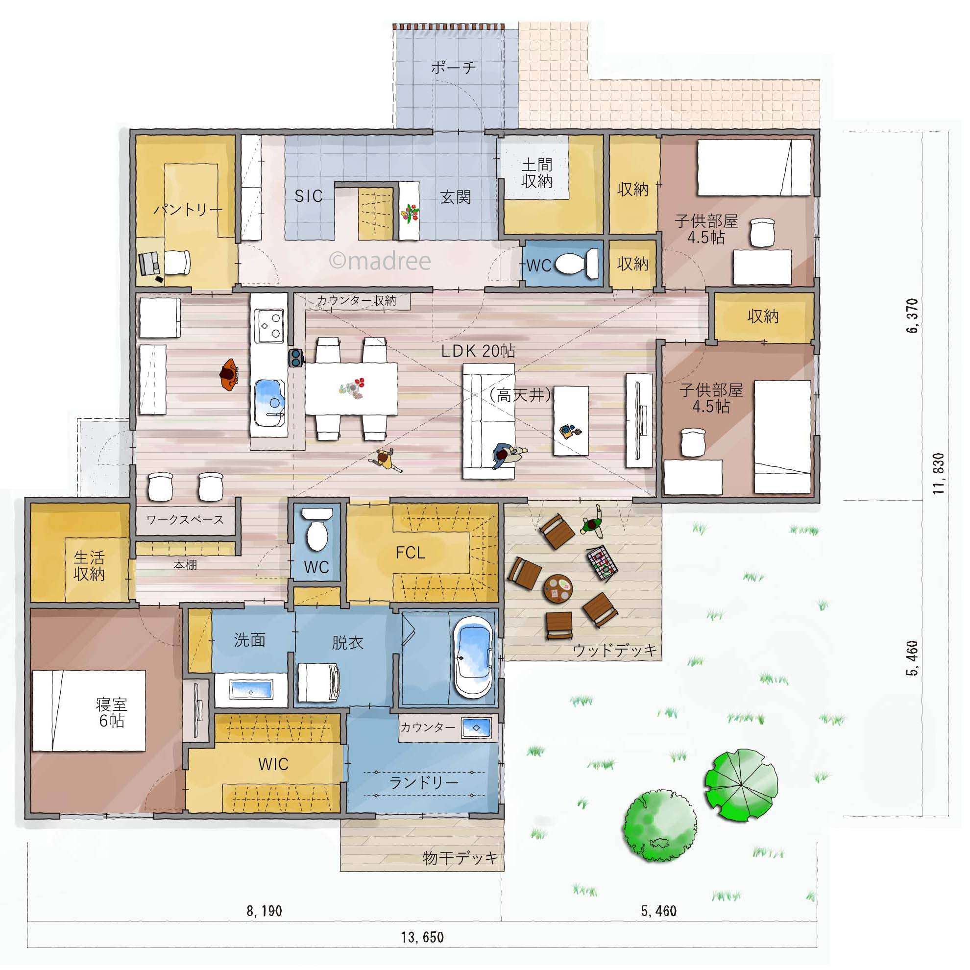 44坪 4LDK玄関直結パントリーでサッと片付く、収納重視した同居予定の二世帯住宅の間取り図「madree マドリー 」。