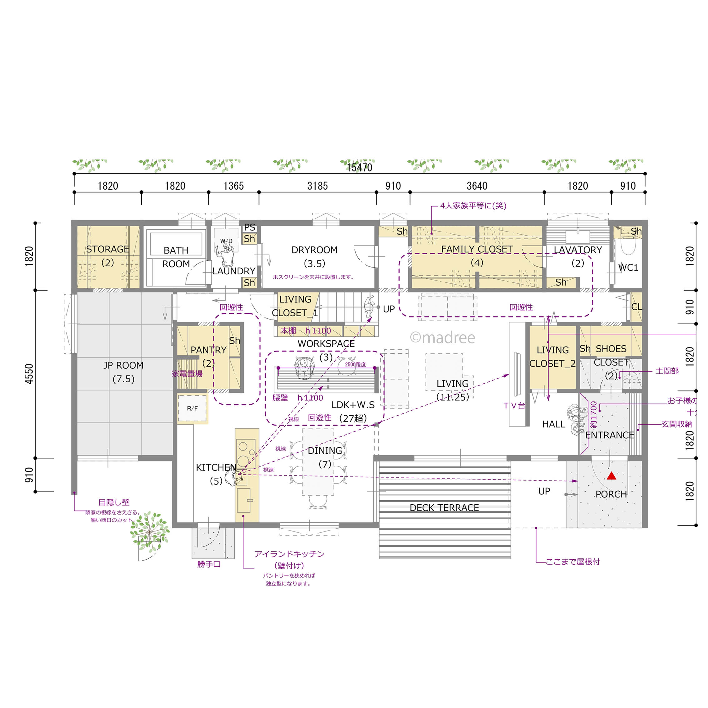 回遊動線家事動線ランドリールームパントリー間取りハーフ吹き抜け吹き抜け小屋裏畳コーナーファミクロシュークロペニンシュラキッチンアイランドキッチンインナーバルコニ。