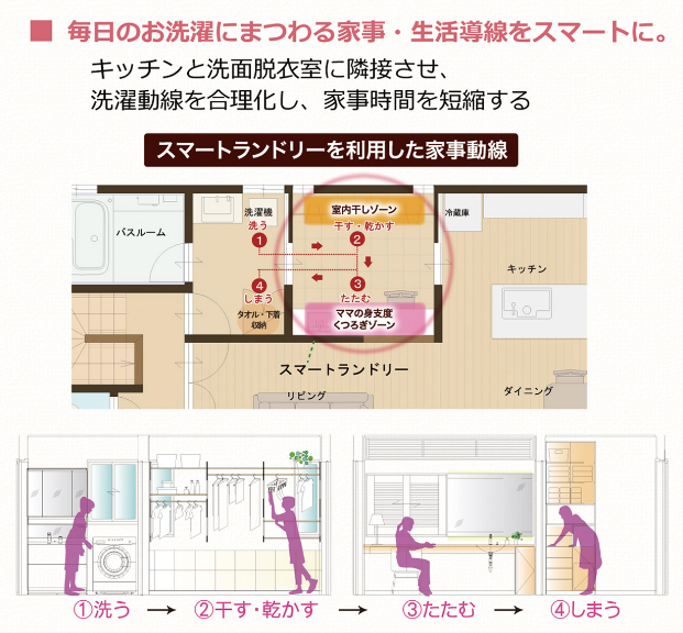 家事動線に優れた間取りとランドリールームについて注文住宅・工務店ならサティスホーム - 三重県四日市・津市。